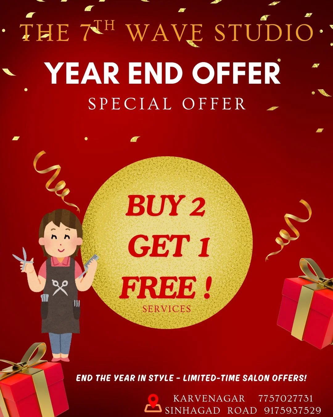 The 7th Wave Studio Year End Offer. Special Offer - Buy 2 Get 1 Free! Services. End The Year In Style – Limited-Time Salon Offers! Karvenagar 7757027731 Sinhagad Road 9175937529