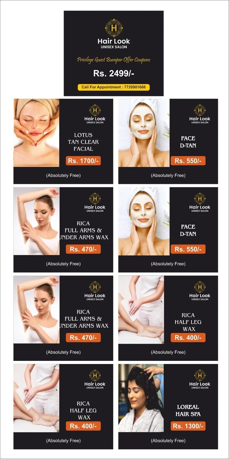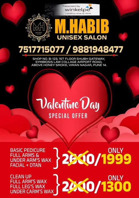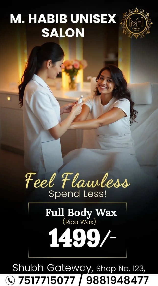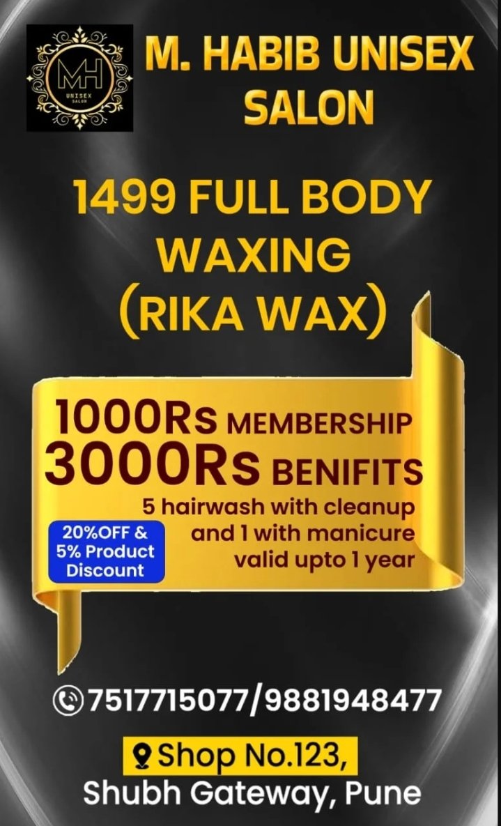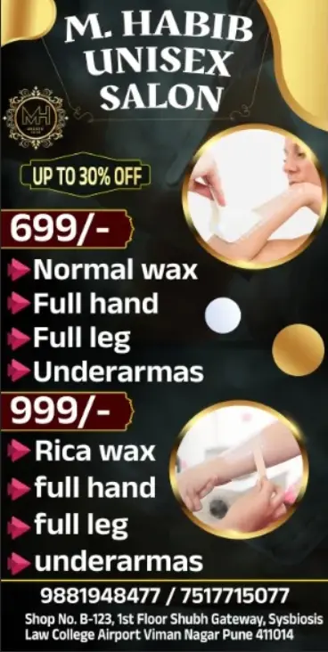M. HABIB UNISEX SALON OFFERS UP TO 30% OFF Rs.699 - Normal wax, Full hand, Full leg, Underarms. Rs.999 - Rica wax, Full hand, Full leg, Underarms. Contact: 9881948477 / 7517715077